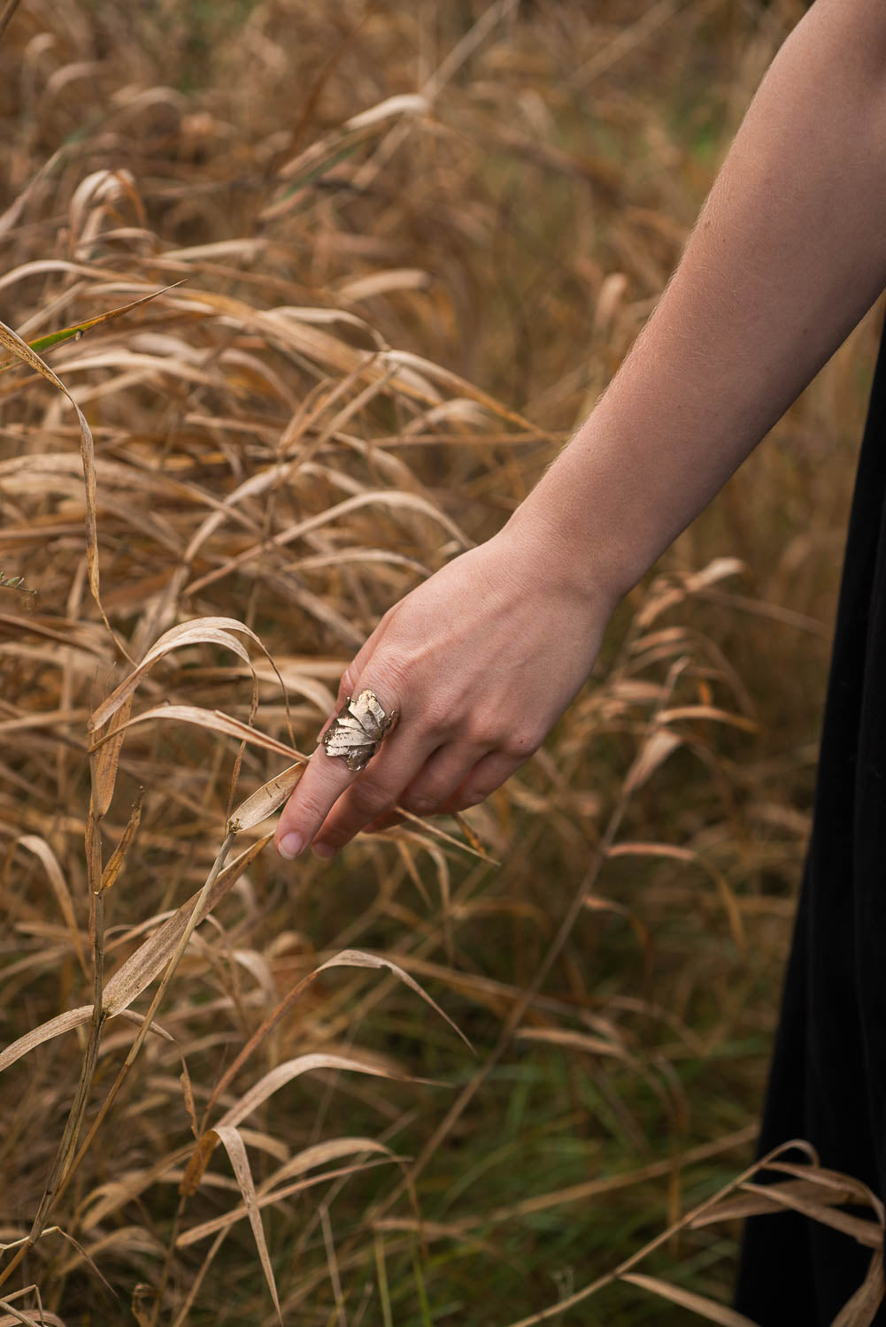 Cette grande bague feuille mesure 3 cm de hauteur. Elle fait bien sur les mains qui ont de longs doigts.
